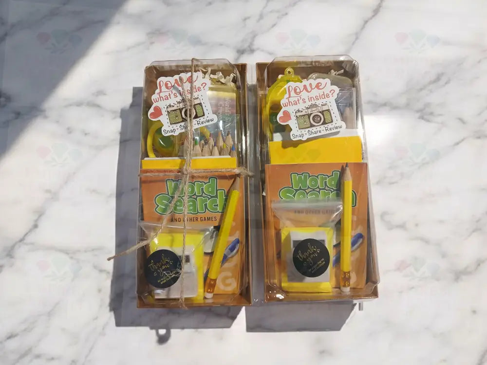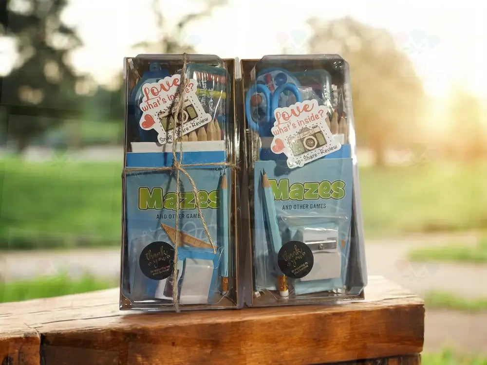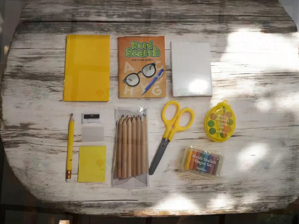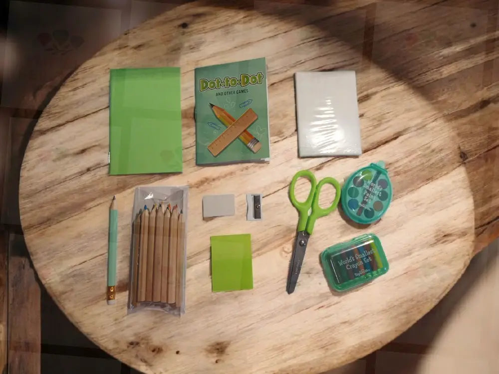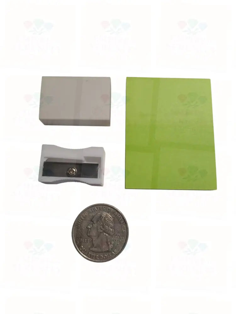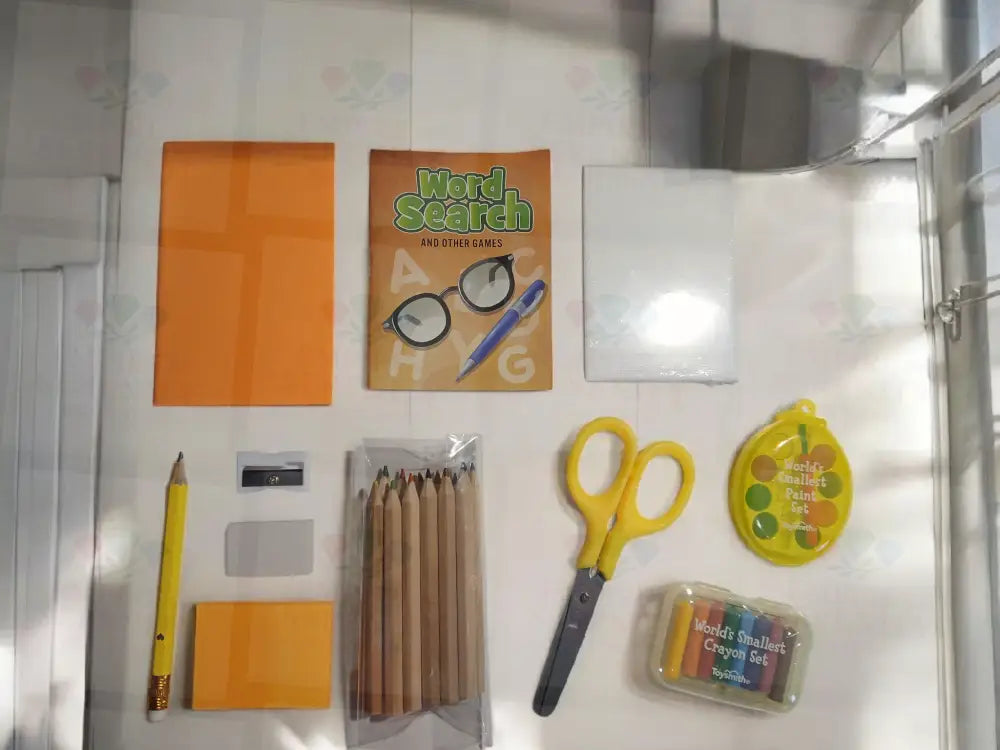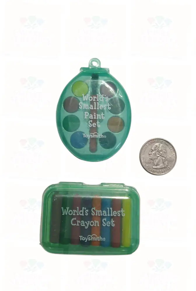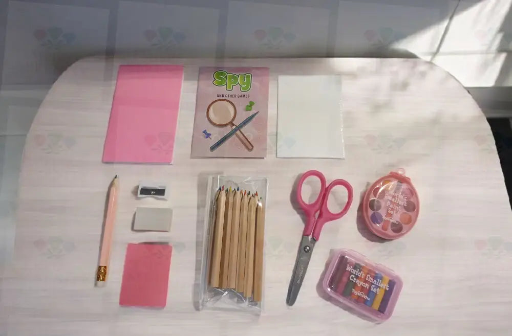 Each set features a delightful collection of mini art essentials, including a miniature crayon set, paint set, and colored pencils, along with a tiny eraser, pencil sharpener, and a golf-sized pencil. It also comes with a matching set of miniature sticky notes, activity book, a notebook, an art canvas measuring 2.5 x 3.5 inches, and a small pair of scissors. All pieces are thoughtfully paired together to create a charming, colorful art kit that inspires creativity in the cutest way!