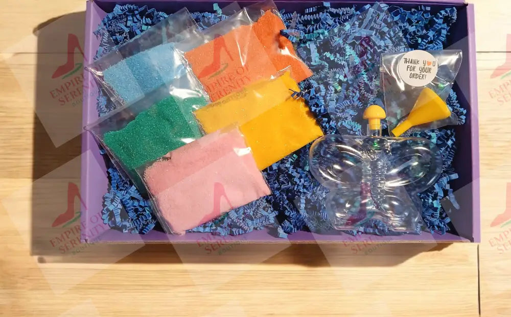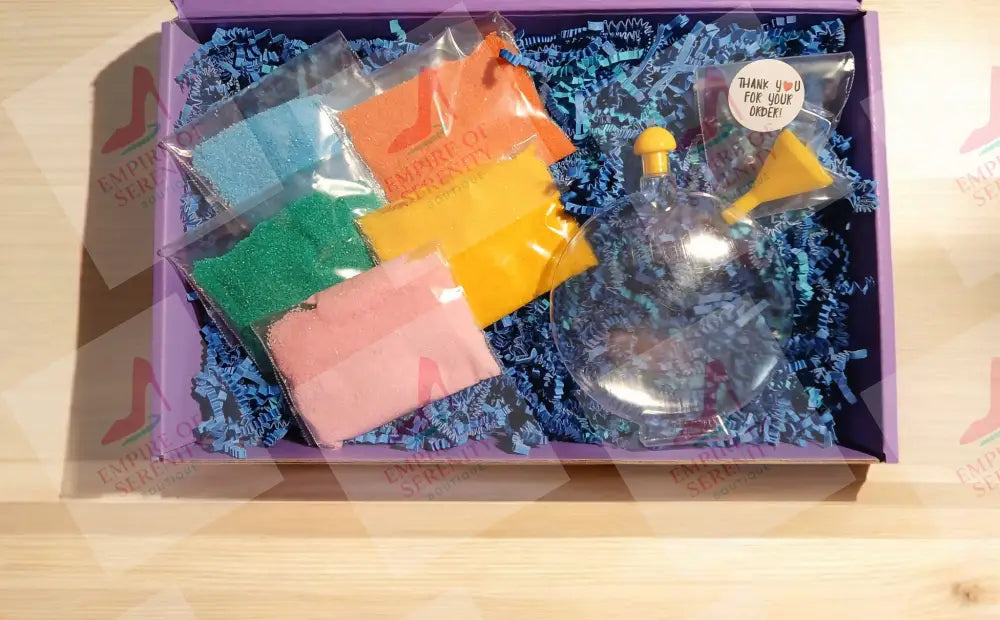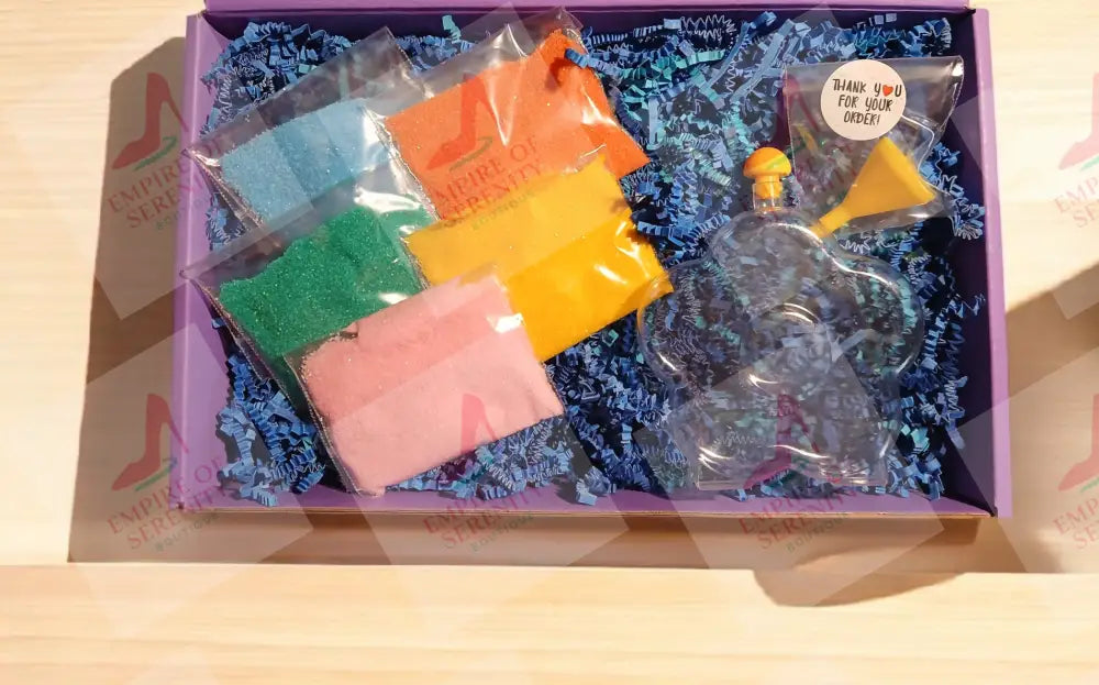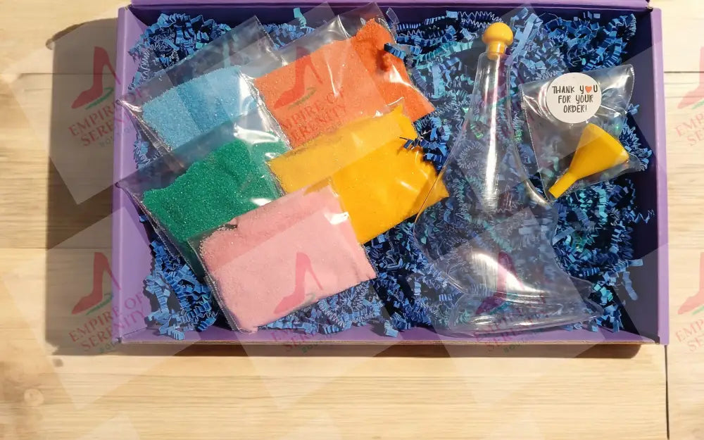 Bring calm and creativity together with our elegant Sand Art Kit. Layer soft pastel and vivid hues into a clear keepsake bottle of your choice — butterfly, flower, moon, or circle, using a mini funnel. Each kit includes five colorful bags of vibrant sand. Craft your masterpiece and watch it glow in the dark! Perfect for gifts, parties, or a cozy creative moment.