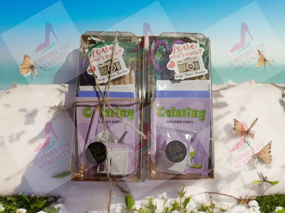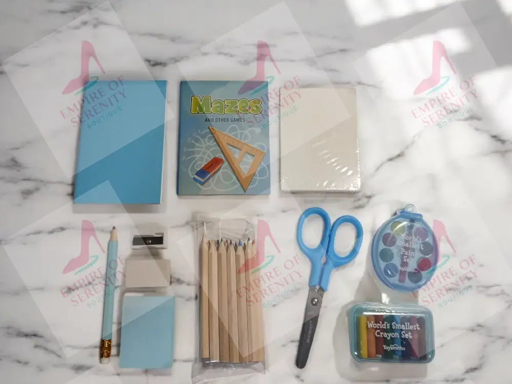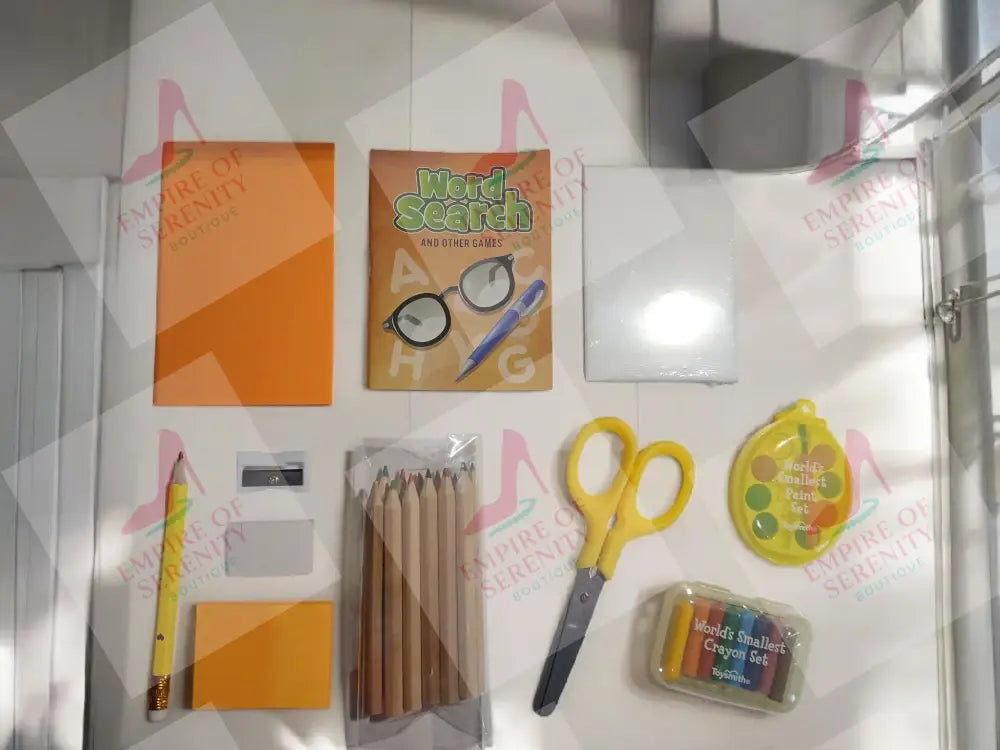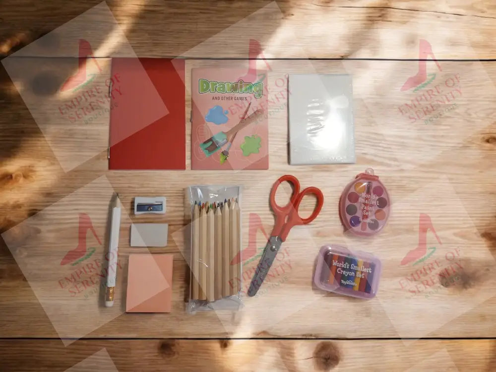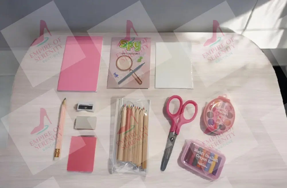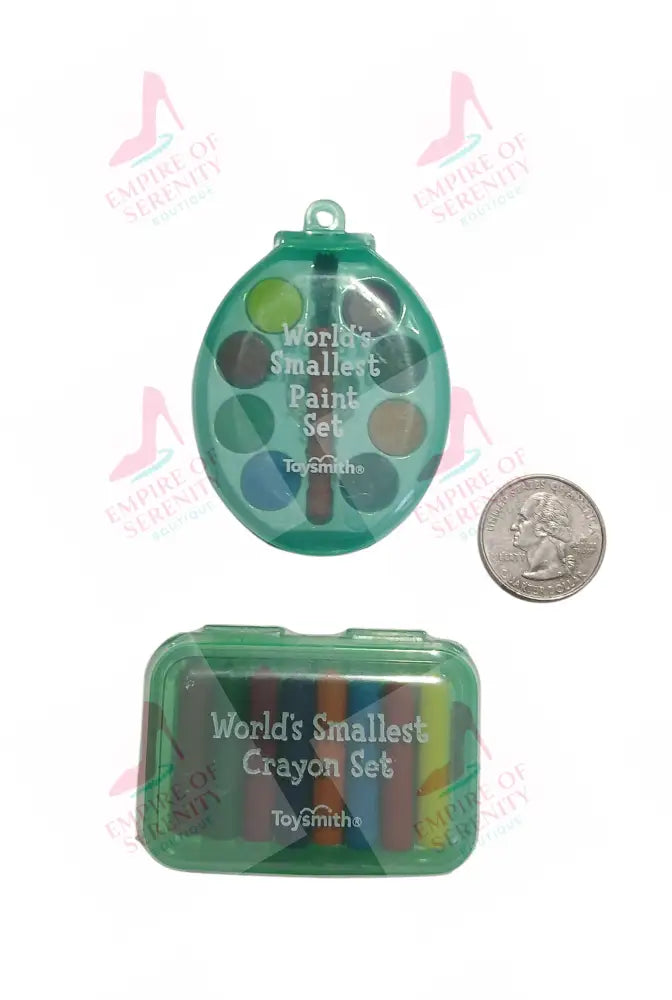 Each set features a delightful collection of mini art essentials, including a miniature crayon set, paint set, and colored pencils, along with a tiny eraser, pencil sharpener, and a golf-sized pencil. It also comes with a matching set of miniature sticky notes, activity book, a notebook, an art canvas measuring 2.5 x 3.5 inches, and a small pair of scissors. All pieces are thoughtfully paired together to create a charming, colorful art kit that inspires creativity in the cutest way!